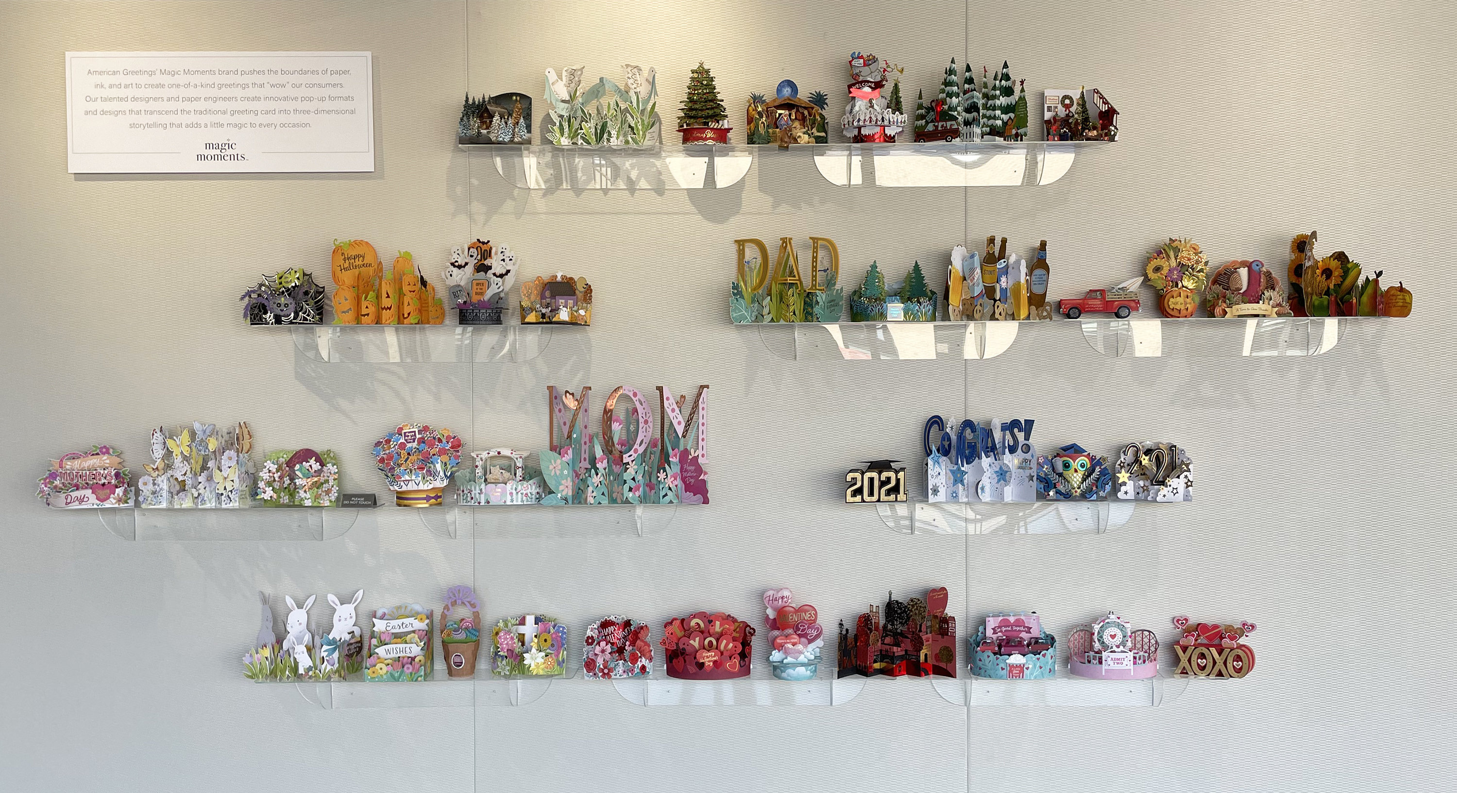 At American Greetings, between 2013-2023, I worked with a wide array of technical and creative processes to create premarket prototypes and unique promotional materials, as well as showroom and retail displays. My position was a crucial step in between the designers and the merchandisers, ensuring quality control and accuracy as projects moved from concept to production. All content on this page is © American Greetings Corporation 2023.